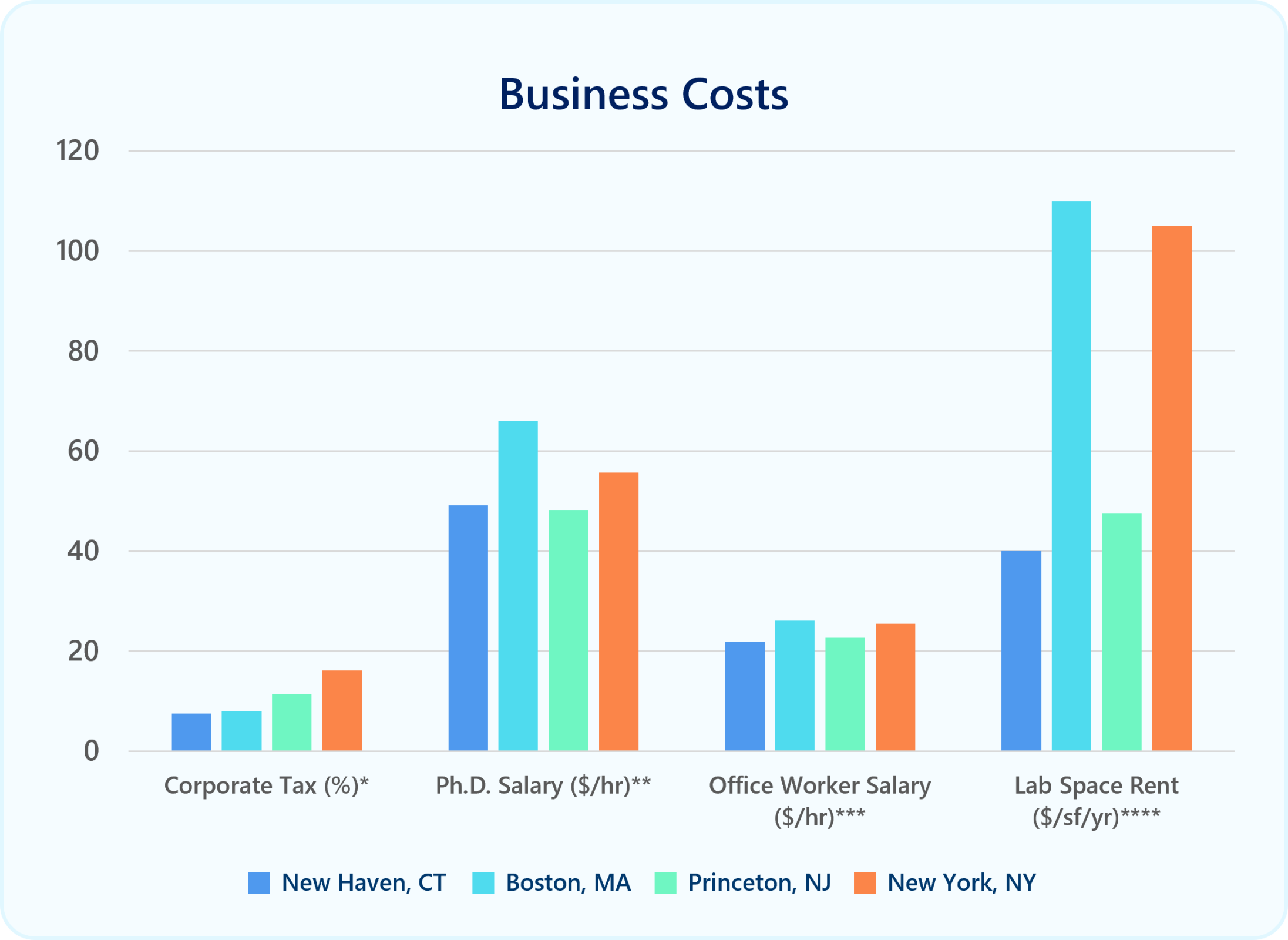 Connecticut offers a clear cost advantage for life sciences companies compared to traditional East Coast and national hubs, enabling companies to deploy capital more strategically. Lower overall operating expenses—across talent, facilities, and taxes—mean that companies can extend their runway, invest more heavily in research and development, and scale operations without the same financial pressure experienced in larger markets. For international firms entering the U.S., this translates into a more efficient path to market: the ability to establish a presence, hire highly qualified talent, and secure specialized lab space without overcommitting resources upfront. Rather than diverting significant portions of funding toward overhead, companies in Connecticut can focus on innovation, clinical progress, and commercialization. For international companies prioritizing affordability without sacrificing access to talent or infrastructure, Connecticut represents the most efficient entry point into the U.S. market.